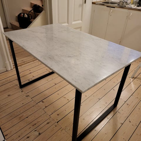 Marmorskiva utan ben, tillverkad i massiv italiensk Carraramarmor (2 cm tjock). Skivan är i gott skick med några mindre skador som knappt är synliga och inte påverkar helhetsintrycket. Perfekt som bordsskiva, bänkskiva eller för eget projekt.