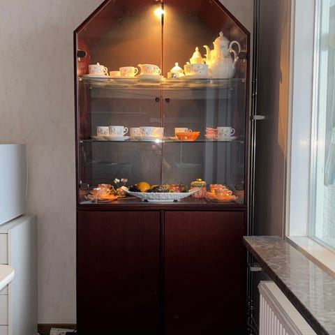 Träskåp med två vitrindörrar och förvaringsutrymme nedtill. Skåpet är av mahogny och är i mycket bra skick. SKåpen kan köpas tillsammans eller separat. Pris kan diskuteras!