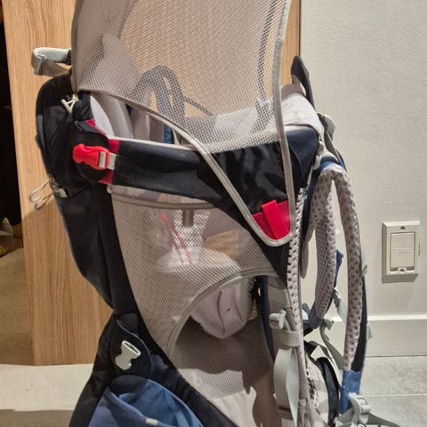 Osprey Poco AG barnbärstol i grön färg. Bärstolen har justerbara remmar och vadderad sits för barnets komfort. Designad för att bära barn säkert och bekvämt under vandring eller promenader. Utrustad med stabil ram och nätpaneler för ventilation.