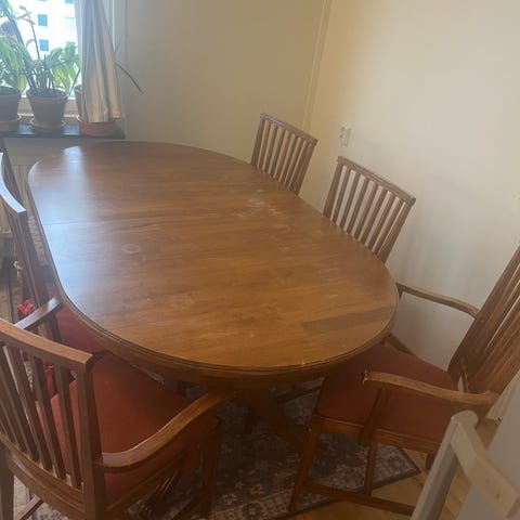 8 stolar med ryggstöd och klädda sitsar. Stolarna har en mörk trästomme och sitsar med mönstrat tyg.