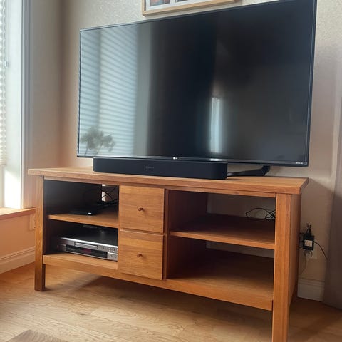 Tv-bänk i ek med fyra praktiska lådor. Längd 200cm, Bredd 45cm, Höjd 40cm. Har tidigare stått på ben men dessa finns inte kvar. Liten skada i ena hörnet, se bild.