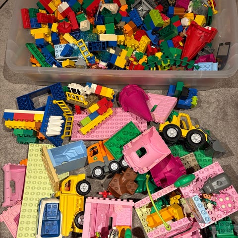 Massor duplo, plattor, klossar i olika storlek, många fordon, staket, gubbar mm. Lekt skick och från olika tider. Urskiljer bondgårdstema och pirattema.