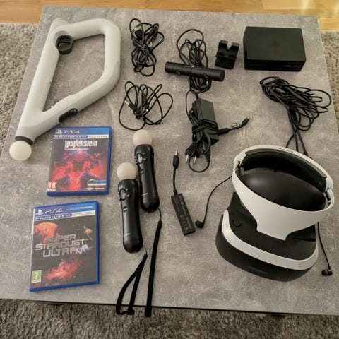 Ingår: headset, kamera, processor-box, 2 Move Motion Controllers och VR-spel Robinson (obrutet).