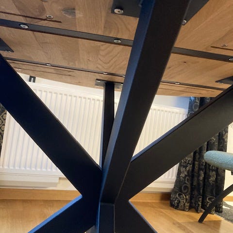 Yumi, vitpigmenterat runt matbord med lätt utställda ben.