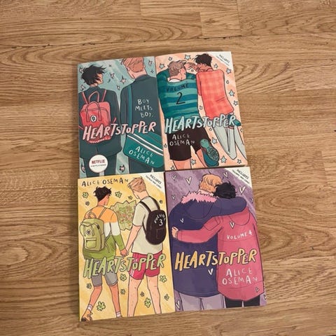 Alice Oseman Heartstopper Serie Volym 1. En grafisk roman som berättar en historia om vänskap och kärlek mellan två pojkar. Boken är i serieformat och innehåller illustrationer.
