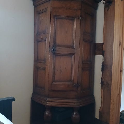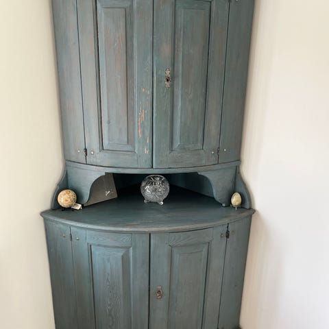 Blått hörnskåp i trä med målad dekor på dörr och låda. Skåpet har en dörr och en låda med dekorativa målningar, samt hyllplan inuti för förvaring. Skåpet är avsett att placeras i ett hörn och erbjuder förvaringsutrymme i ett kompakt format.