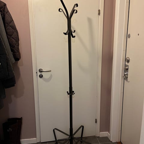 Stilren och praktisk tamburmajor i svart metall med hyllor i trä. Plats för jackor, skor och accessoarer. Stabil konstruktion som tar lite golvyta, perfekt för hallen.
