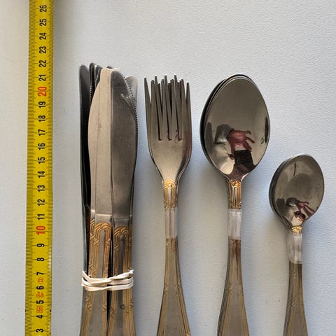 Bestickset i rostfritt stål bestående av 18 delar: knivar, gafflar och skedar.