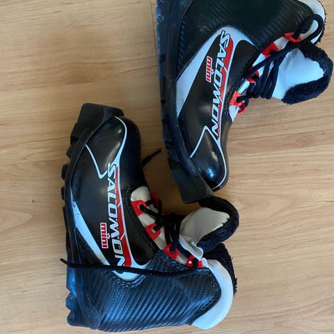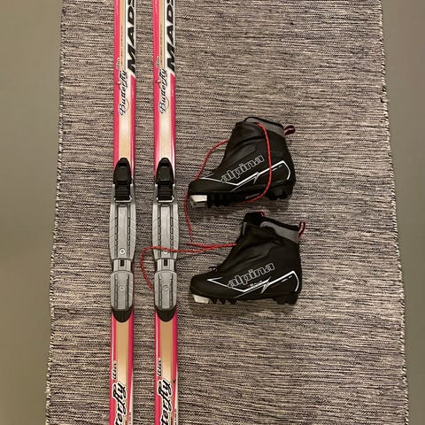 Längskridskor med pjäxor (Telemarkspjäxor) i bra skick