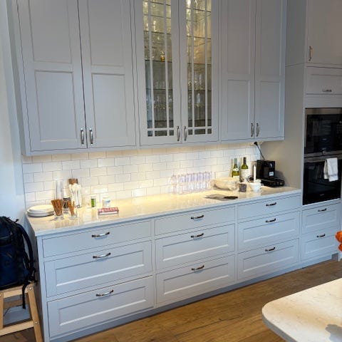 Noblessa kök, inköpt 2022, felfritt kök med högblanka vita luckor. Mycket fräscha vitvaror från Siemens, där diskmaskin och kylskåp/frys är inbyggda. Bänkskiva är i laminat (Dekor kvartsit).