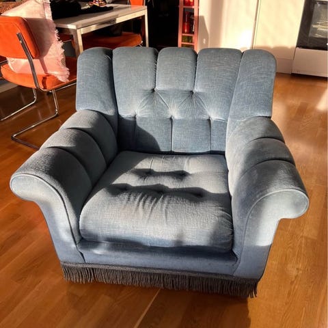 Skönt fåtölj. Fint skick men hade behövt tvättas vid armstöden som syns på bilderna. Hämtas i Vollsjö, kan ev levereras till Malmö mot en liten peng.