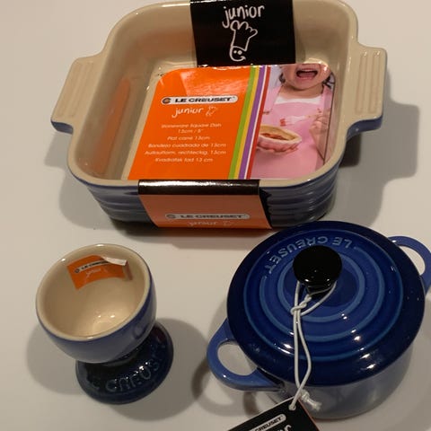 Le Creuset Junior Set köksutrustning för barn . Setet inkluderar en liten gryta med lock, en liten ugnsform och en äggkopp. Produkterna är utformade för att likna Le Creusets klassiska köksredskap i miniatyrformat, anpassade för barn.