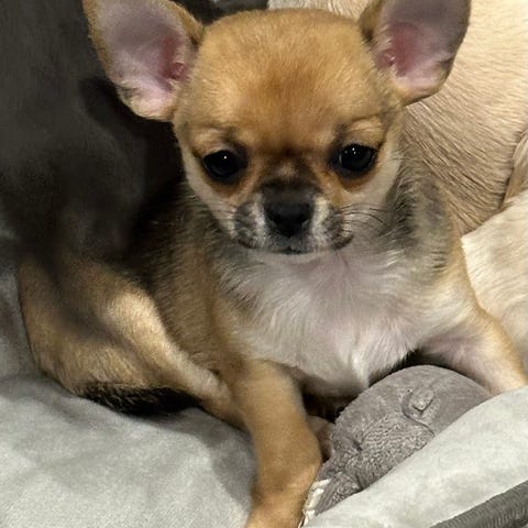 Är inte förtjust i promenader och träning men tycker om att busa och gosa. Kan lämnas själv korta stunder