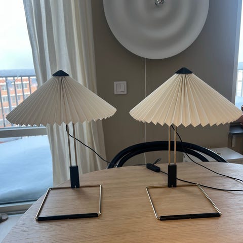 Hay bordslampa med vit skärm och cylindrisk bas. Lampan har en modern och enkel design, lämplig för användning som belysning på bord eller skrivbord.