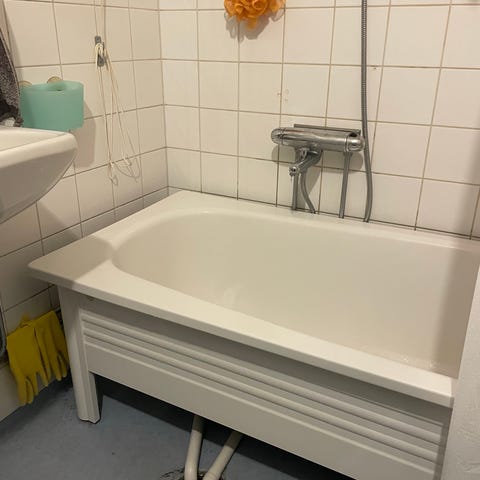 Badkar i vitt emaljerat stål. Badkaret är rektangulärt med avrinningshål och avloppsanslutning. Passar för installation i badrum och är avsett för bad.