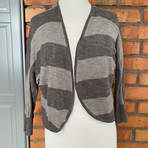 Grå kofta i storlek S. Tillverkad i ett lätt material med trekvartsärmar och öppen front med knytning.