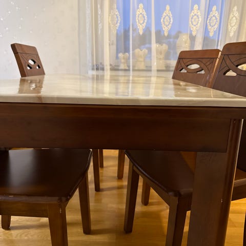Det är i använt skick, finns små skador på bordet ( se bilder ) samt små repor. Men helhetsintrycket är väldigt fint. Behöver putsas upp på benen, annars fina. Stolarna är tvättade med textiltvätt för ca 1 vecka sedan.
