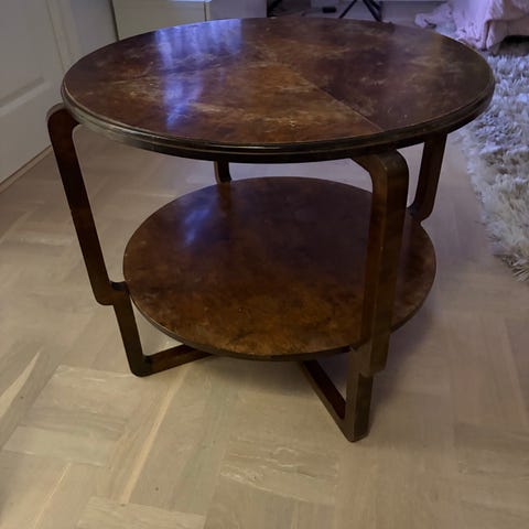 Runt bord i trä med ett dekorativt mönster på bordsskivan. Bordet har en undre hylla och böjda ben, vilket ger det en klassisk och funktionell design.