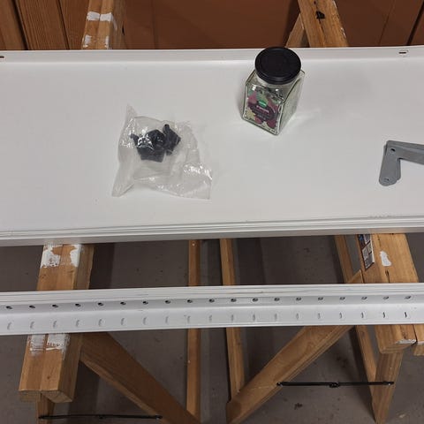 (OBS det är smala fästen 90 konsolerna så behövs bara en skena i mitten som två hyllplan kan fästa på bredvid varandra)