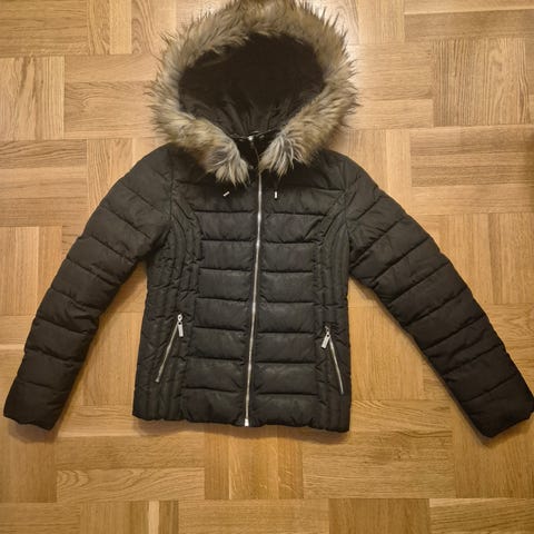 Svart jacka med grå detaljer och en avtagbar huva med fuskpäls. Jackan har dragkedjor och är designad för komfort, vattenavvisande, andningsbar och vindtät.