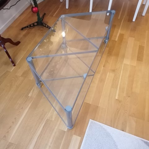 Ett fint glas bord inga skador, samma med spegeln inga skador. Pris på båda är 450