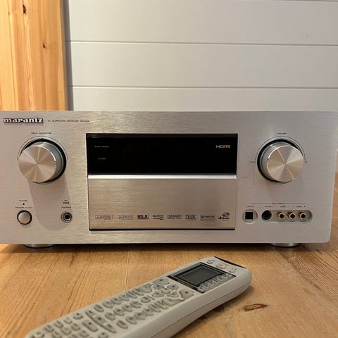 Marantz nr 1604receiver med flera anslutningar inklusive HDMI, komponentvideo och ljudingångar. Enheten är utrustad med en medföljande fjärrkontroll för enkel hantering.