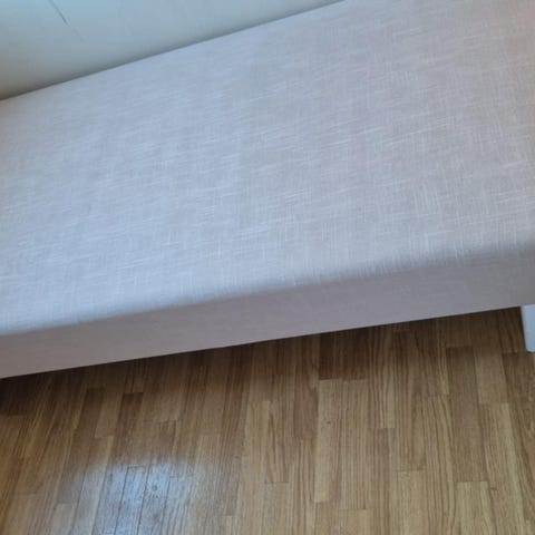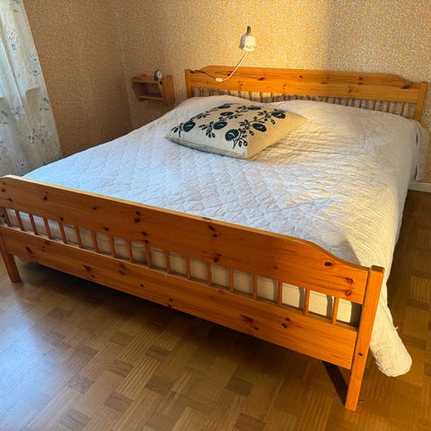 Dubbelsäng 180 cm i furu med tillhörande madrasser. Kommer med två sängbord, cirka 50-55 cm breda.