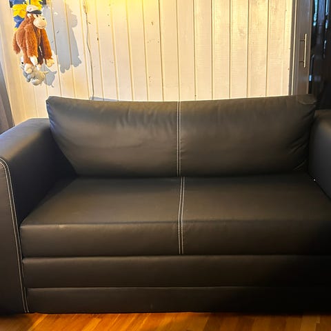 En liten nätt bäddsoffa i mörkgrått, som bäddas framåt. Har använts som extrasäng och stått i sonens rum.