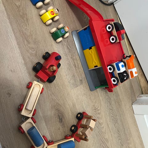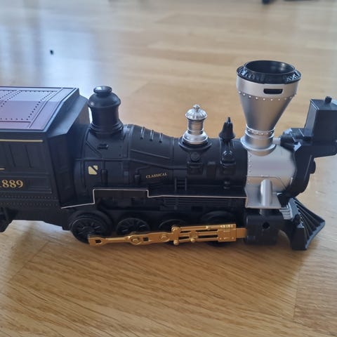 Ett jättefint tåg med släp för barn att åka på. Man kan koppla på släp. Släpet går också att åka på separat. Rullar lätt och roliga att åka på! Utmärkt skick!