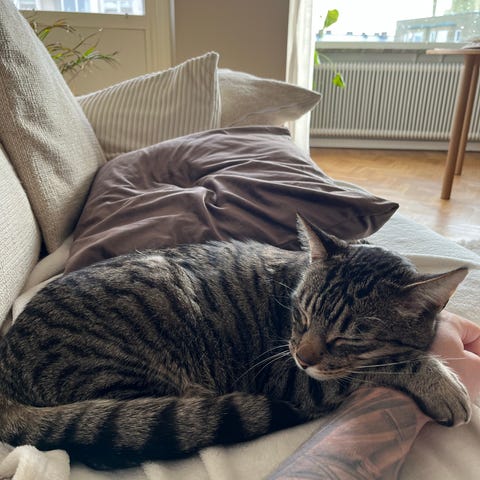 Tyvärr så är det så att Juni blir väldigt stressad här hemma då vi har fler katter. Hon blir ofta jagad av de andra och lever största delen av sitt liv i min säng pga detta.