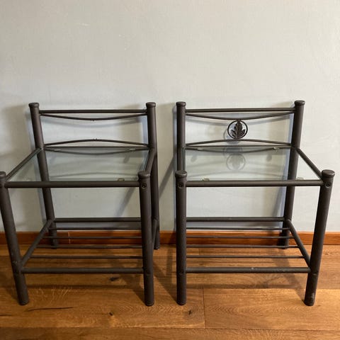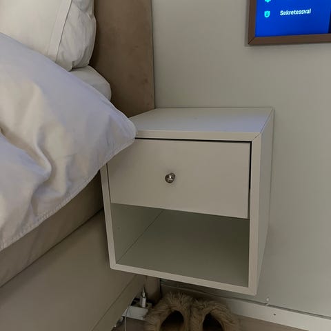 Sängbord med förvaringslåda och glasplatta i grått tyg. Möbeln är placerad intill säng och fönster, och har en övre glasskiva som kan användas som avlastningsyta samt en nedre förvaringslåda för praktisk förvaring. Inbyggd belysning som är dimbar.