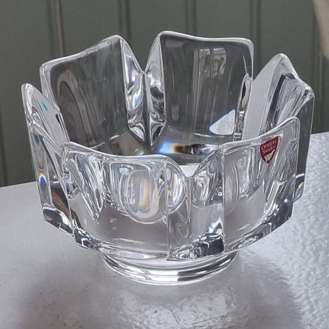 Orrefors skål tillverkad i klarglas. Skålen har en dekorativ form och kan användas för olika ändamål i hemmet, som servering eller dekoration. Pris 600 för två