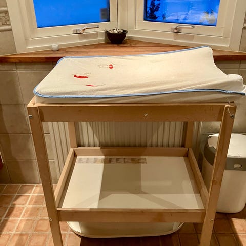 Skötbord med behållare, papperskorg, och hållare för mobil. Kan skicka med extra överdrag till skötbädden (dvs ni får två). Det ena har antydan till någon fläck men funkar fint och är tvättat givetvis!