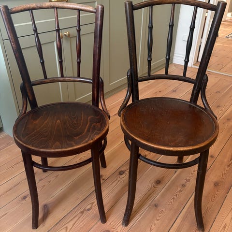 Fyra stycken böjträstolar/caféstolar, liknande Thonet, Öglan av okänd tillverkare. Klassisk och nätt stol med räfflad träsists. Stolarna har varierande slitage i form av färgsläpp och skav. Men alla är hela och stabila. Kan köpas för 250kr styck eller alla fyra för 800kr.