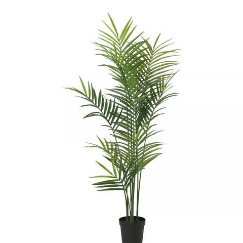 Konstgjord palmväxt i grön färg med flera stjälkar och löv, placerad i en svart kruka. Passar som dekorativ växt i olika miljöer.