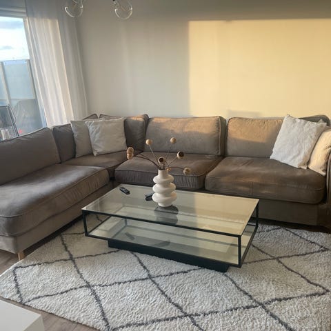 Säljer nu vår stora soffa! Den är 3,2m i bredd på båda hållen samt 1.2m djup! Tyget är beige sammetstyg! Väldigt fin och skön soffa men tyvärr för stor för vårt vardagsrum så vi tvingas sälja den! Nypris 36999 på XXL-lutz
