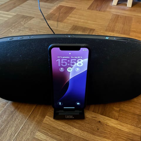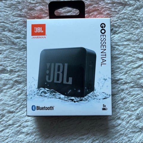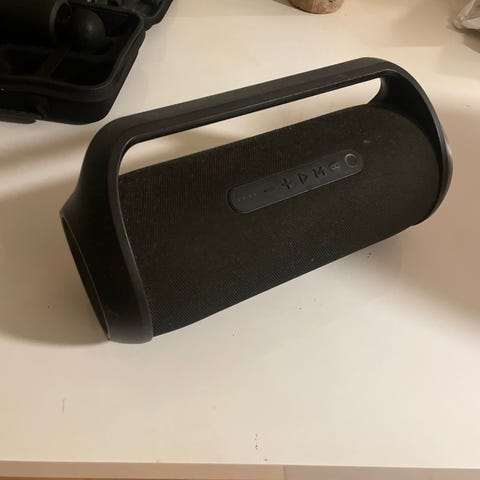 JBL bärbar högtalare i svart färg. Produkten inkluderar en laddningskabel, en snabbstartsguide och ett skyddande fodral för förvaring av den tillkommer även. Högtalaren är kompakt och lämplig för bärbar användning och fungerar felfritt.