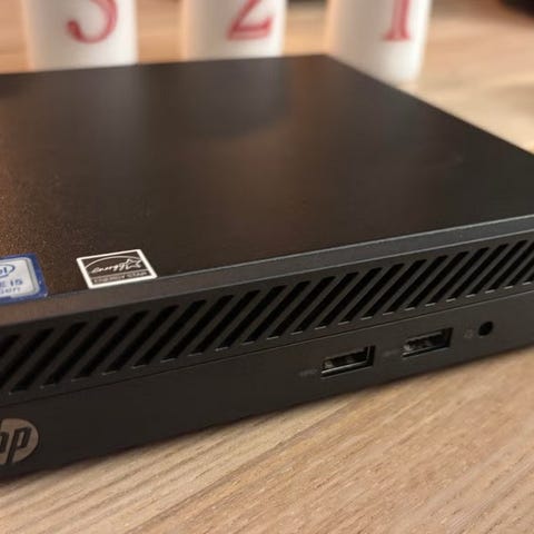 HP Mini PC med kompakt design. Enheten har flera USB-portar, nätverksport, VGA-utgång och PS/2-portar för anslutning av tangentbord och mus. Passar för användning i miljöer där platsbesparing är viktigt.