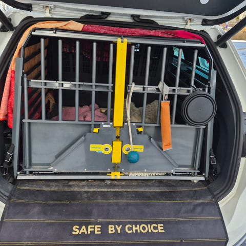 Mimsafe dubbelbur i bra skick, nyckel finns. Monterad mellanvägg, heltäckande gummimatta.