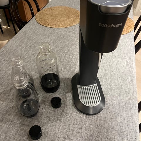 Sodastream kolsyremaskin i svart färg och plastflaska.