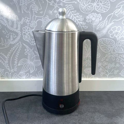 C3 kaffebryggare i vitt och svart. Utrustad med handtag och lock, samt avtagbara delar för bryggning. Elektrisk anslutning med sladd för strömförsörjning.