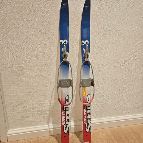 Edsbyn längdskidor för barn, 90 cm, med kabelbindningar, dvs funkar med skor / kängor. Stavar ingår. Barnskidor.