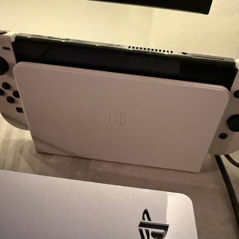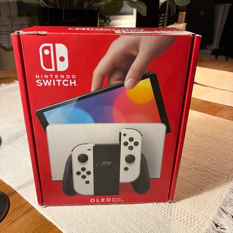 spelkonsol med Joy-Con-kontroller i flera färger (röd och grön), laddningsdocka i rött, strömadapter, HDMI-kabel och nytt skärmskydd Konsolen har en pekskärm och kan användas både som bärbar enhet och ansluten till TV via dockan. Passar för spel inom Nintendo Switch-plattformen.