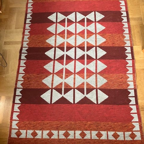 Notera att mattan har lösa trådar (syns på bild) och små färgskiftningar efter slitage.