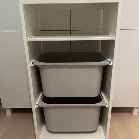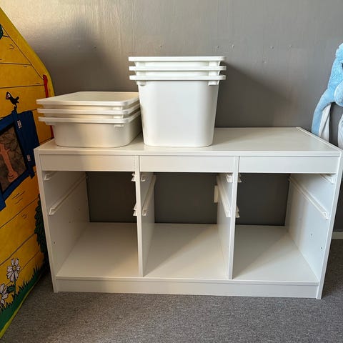 IKEA Trofast barnmöbel med 6st förvaringslådor i plast. Möbeln är vit och har tre sektioner med två lådor i varje sektion, lämpad för förvaring av leksaker eller andra barnrelaterade föremål.