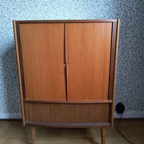 Praktiskt och rejält skåp inrett för vinförvaring, med barnsäker öppning. Svag missfärgning efter kruka på ovansidan (se bild)