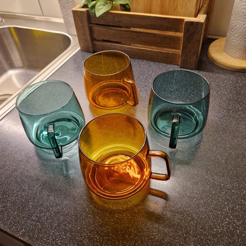 Fyra muggar i bärnstensfärgat glas med dubbelvägg.