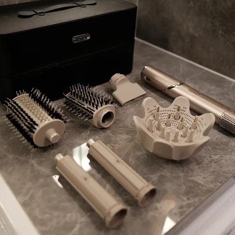 Den innehåller flera tillbehör för olika hårstylingbehov. Setet levereras med en förvaringsväska för enkel förvaring och transport.