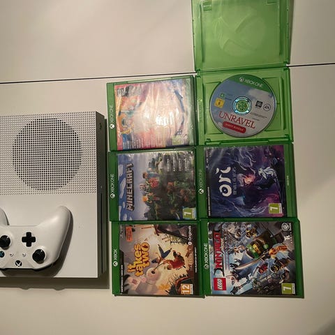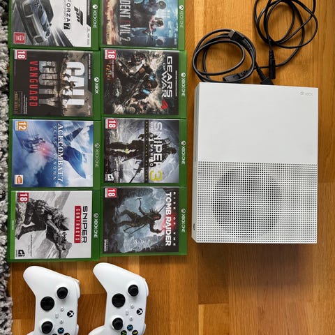 Xbox One S spelkonsol i vit färg med en vit handkontroll. Handkontrollen är i använt skick och har därmed lite defekter.