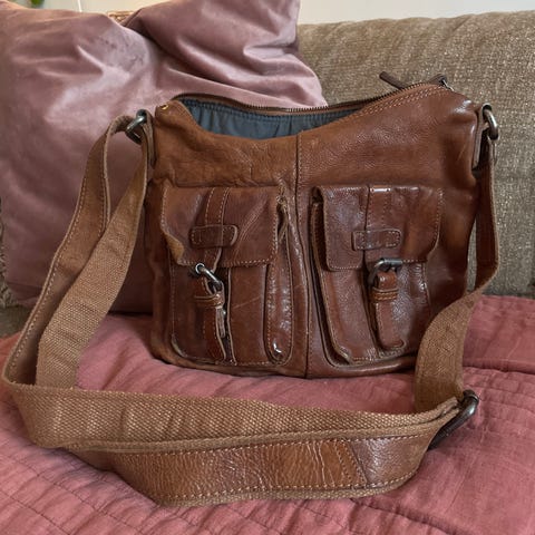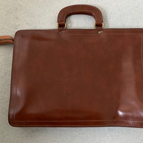 Portfölj i mjukt läder med 4 fack, 2 uppe och ett på vardera sidan. Axelrem samt rem på väskan för att fästa på handbagage.